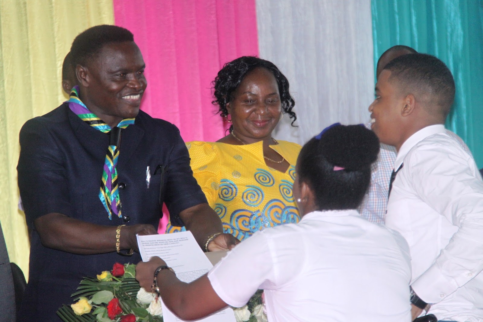 Mohamed na Hefsiba Nyangi wakimkabidhi risala ya wahitimu mgeni rasmi,
